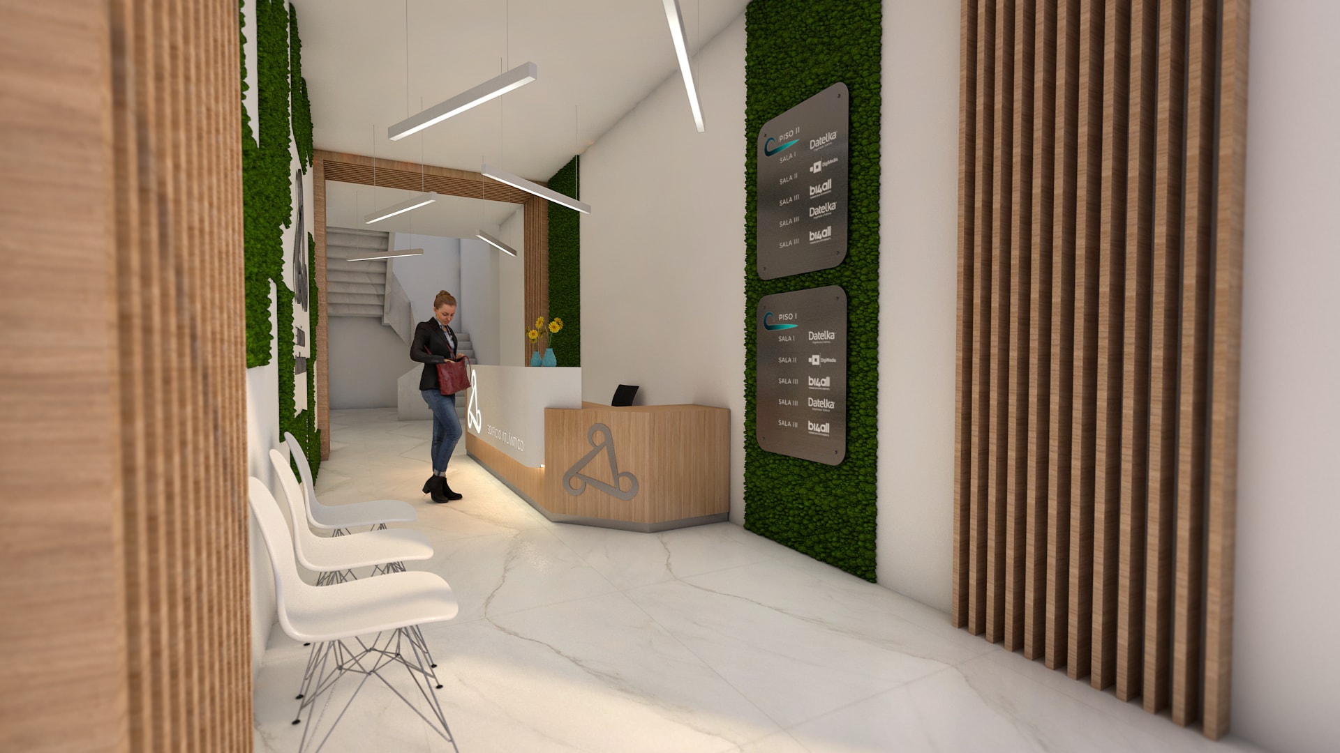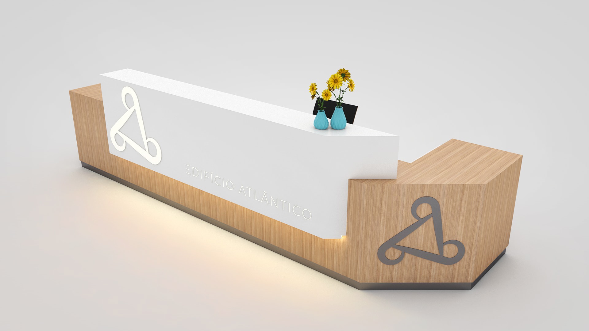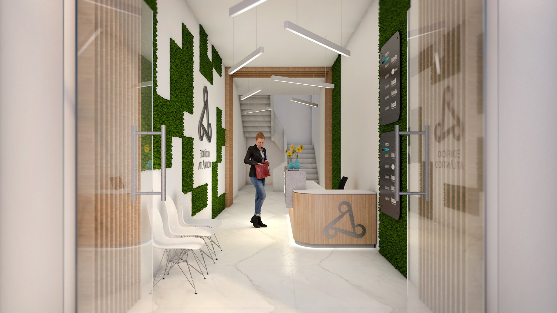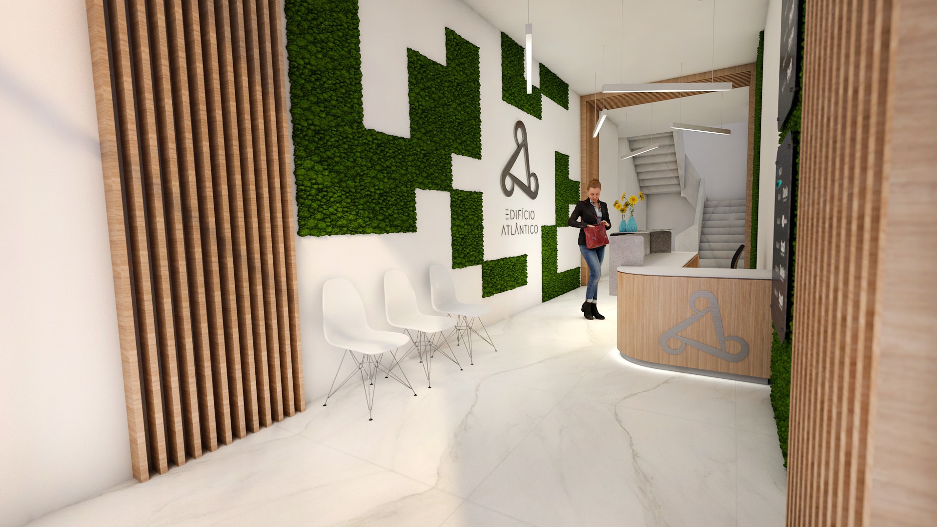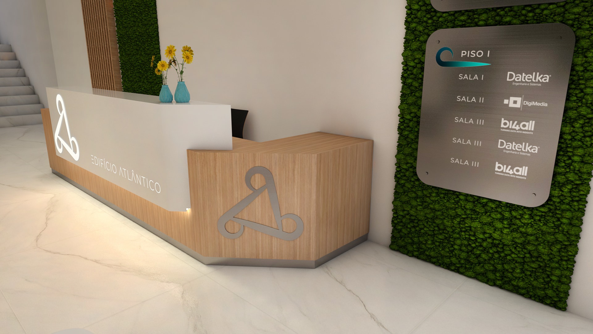 Projeto de redecoração da entrada e receção do Edifício Atlântico, com o objetivo de modernizar o espaço e comunicar a evolução da empresa.
